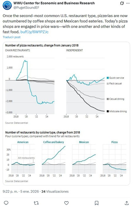 No solo eso, la cantidad de pizzerías distribuidas en EE. UU. ha disminuido desde su pico en 2019. Mientras tanto, las pastelerías y los restaurantes mexicanos han crecido rápidamente.