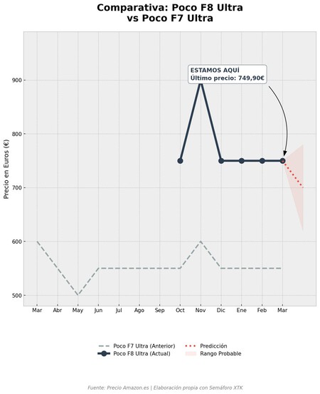 - El Poco F8 Ultra tenía uno debut agresivoy, por tanto, está muy por encima del valor histórico del F7 Ultra (899,99 euros en el octavo mes). Mientras que el modelo anterior (F7 Ultra) mantuvo una notable estabilidad entre 550 y 600 euros, el nuevo buque insignia muestra una volatilidad significativamente mayor con correcciones rápidas de 150 euros después de los picos de precios.