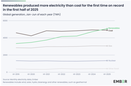 Hace diez años, el carbón iluminaba la mitad del planeta. Hoy son los paneles solares y las turbinas eólicas los que iluminan las estadísticas. En la primera mitad de 2025, las energías renovables no sólo satisficieron el aumento de la demanda eléctrica mundial: la superaron.