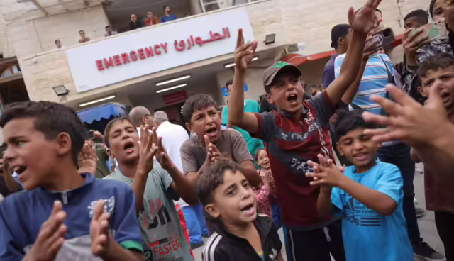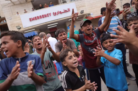 Niños palestinos celebran el anuncio de un alto el fuego frente al hospital Shuhada al-Aqsa en Deir al-Balaah, Gaza. Foto: AFP