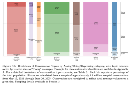 La primera fotografía que ofrece el periódico es clara y debe darse con precisión temporal. En junio de 2025, el 73% de los mensajes se consideraban no relacionados con el trabajo, en comparación con el 27% relacionados con tareas laborales. Esta distribución también cambia respecto a fases anteriores comparadas en el propio estudio, lo que sugiere que el consumo personal aumenta de peso con el tiempo. Los datos son importantes porque desafían una idea muy extendida: que el chat es, ante todo, una herramienta profesional.
