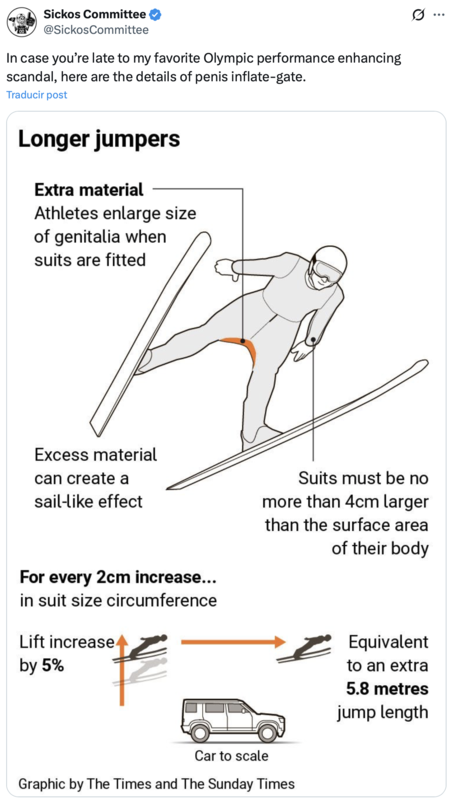 ¿Qué pasó? Algo tan sencillo como complejo: el pene del saltador de esquí está en el punto de mira. Al mismo tiempo que eso Juegos Olímpicos de Invierno que comienzan el viernes 6 de febrero de 2026 en el norte de Italia, se ha extendido el rumor de que los atletas están utilizando sus penes como parte del dopaje técnico para mantenerlos volando.